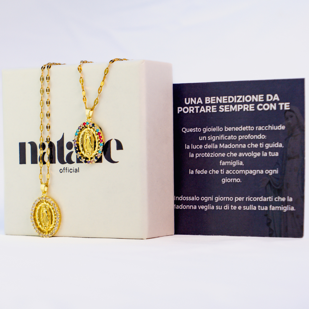 Ogni collana Benedetta racchiude un messaggio di fede, protezione familiare e di spiritualità.